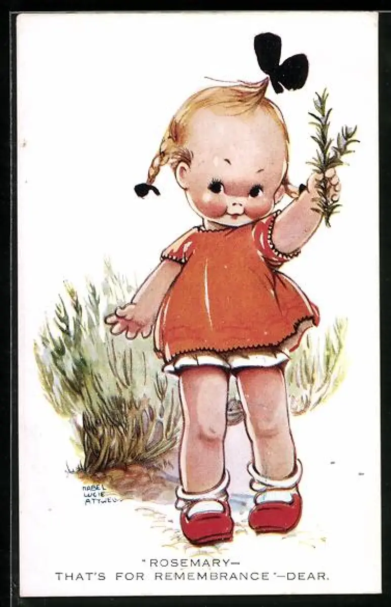 Künstler-AK Mabel Lucie Attwell: Mädchen hält einen Rosmarinzweig hoch