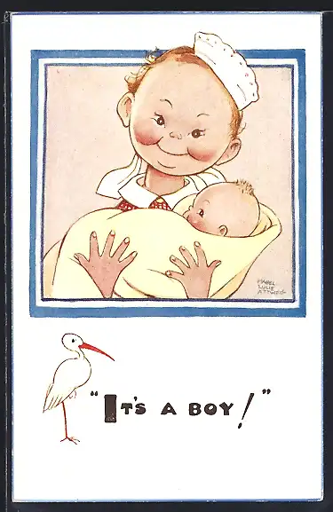 Künstler-AK Mabel Lucie Attwell: Mädchen mit Haube hält Baby im Arm, Storch, It`s a boy!