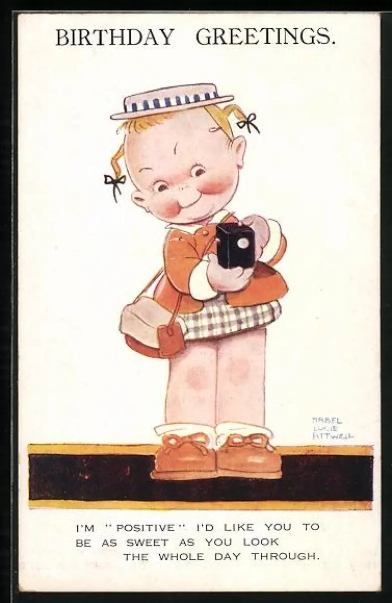 Künstler-AK Mabel Lucie Attwell: Mädchen mit Kamera, I`m `positive` I`d like you to be as sweet as you look