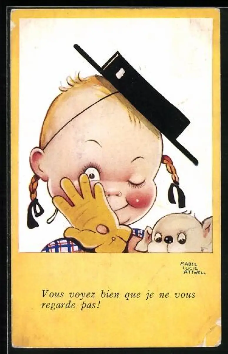 Künstler-AK Mabel Lucie Attwell: Mädchen mit schwarzem Hütchen blinzelt dem Betrachter zu