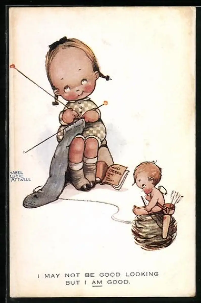 Künstler-AK Mabel Lucie Attwell: Mädchen strickt einen Strumpf und wird von Amor beobachtet