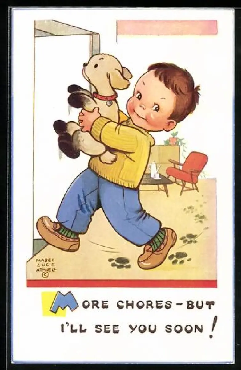 Künstler-AK Mabel Lucie Attwell: More chores, But I`ll see you soon!, Kleiner Junge mit seinem Hund