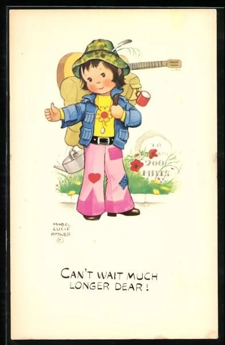 Künstler-AK Mabel Lucie Attwell: Tramperin mit Schlaghosen und Gitarre
