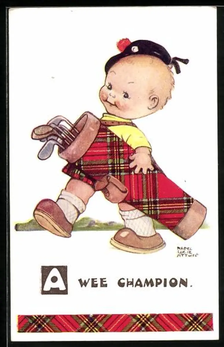 Künstler-AK Mabel Lucie Attwell: niedlicher Bube trägt ein Golfbag