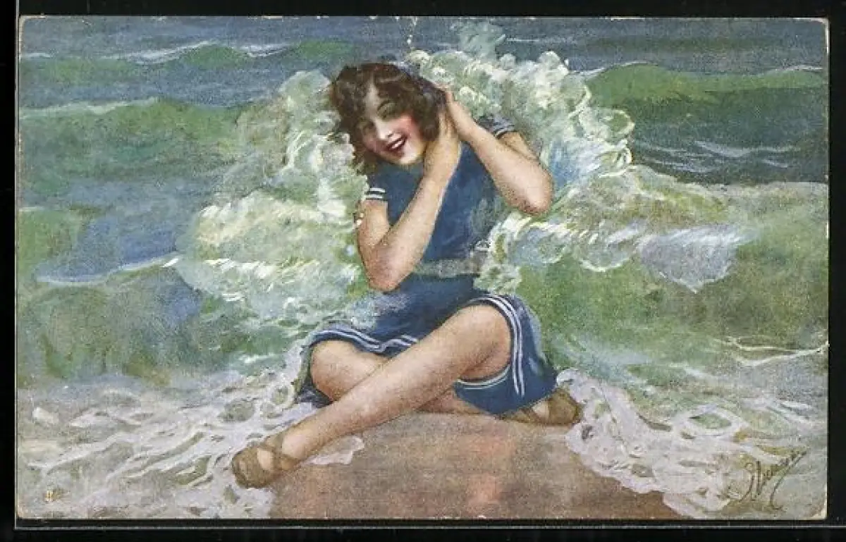 Künstler-AK Mädchen in Bademode vergnügt sich in der Brandung