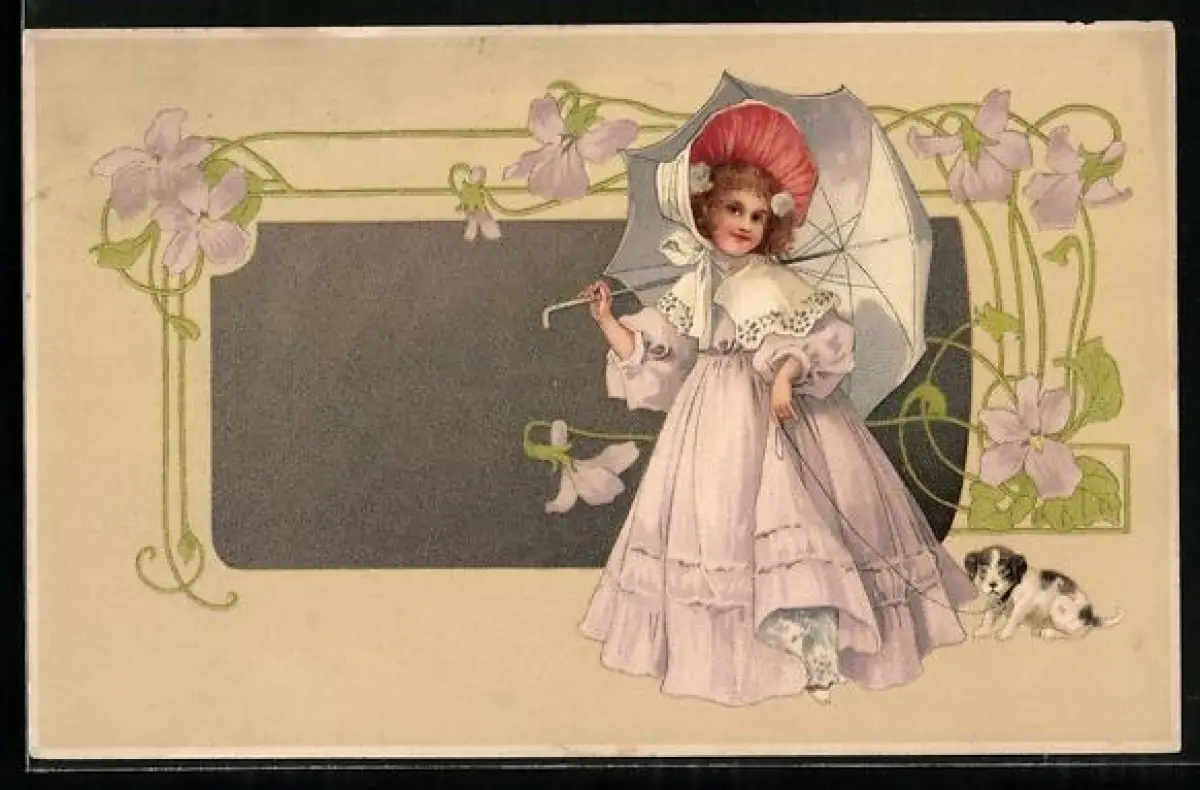 Künstler-AK Mädchen in rosanem Kleid mit einem Welpen, Jugendstil