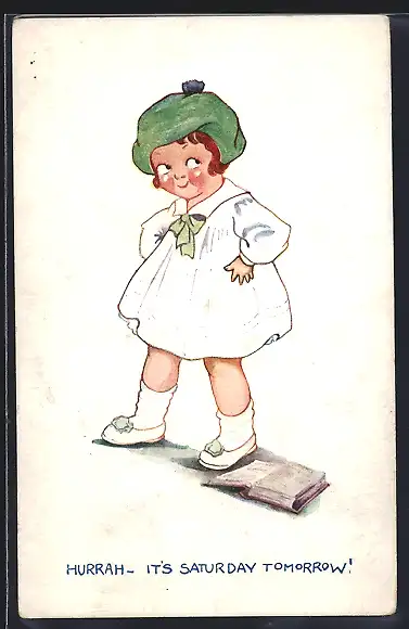 Künstler-AK Mädchen in weissem Kleid steht neben einem Buch, Hurrah, it`s Saturday Tomorrow
