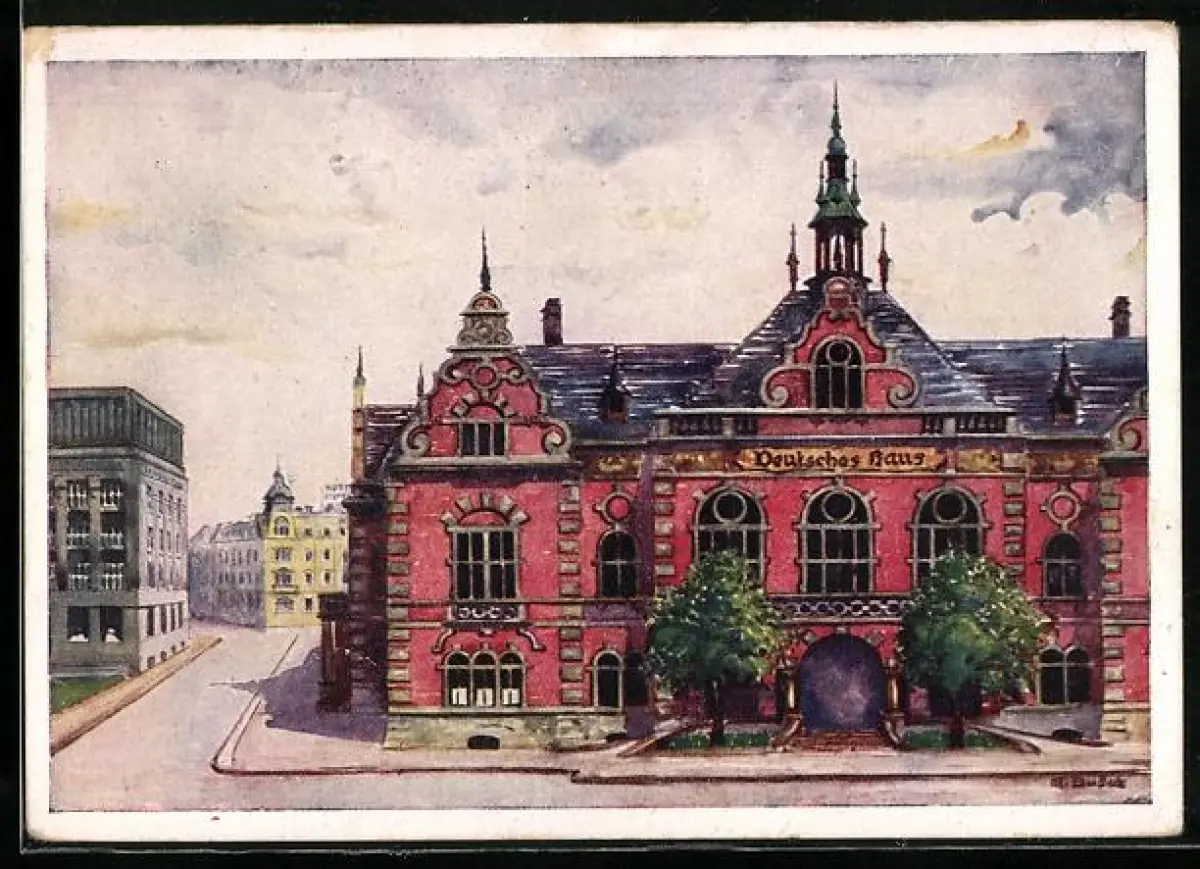 Künstler-AK Mär. Ostrau, Deutsches Haus mit Strassenpartie