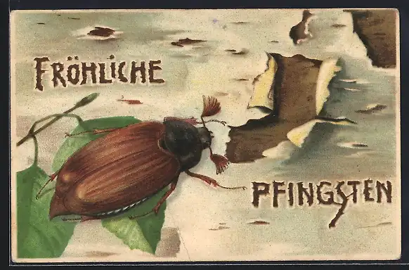 Künstler-AK Maikäfer auf aufgerissener Birkenrinde, Pfingstgruss