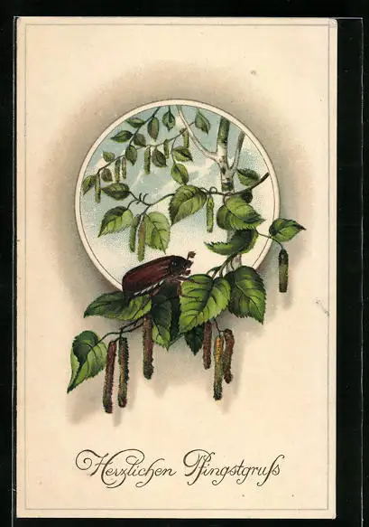 Künstler-AK Maikäfer krabbelt auf Birkenzweig mit Troddeln, Pfingstgruss