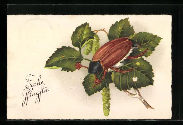 Künstler-AK Maikäfer sitzt auf einem Birkenzweig, Pfingstgruss