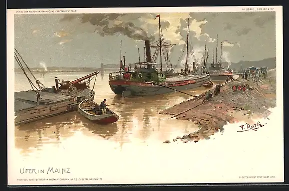 Künstler-AK Mainz, Uferpartie mit Dampfboot