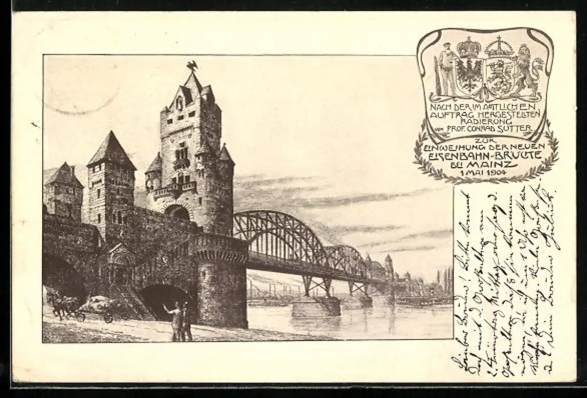 Künstler-AK Mainz, Zur Einweihung der neuen Eisenbahnbrücke 1904