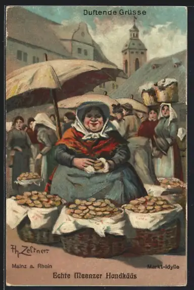 Künstler-AK Mainz a. Rhein, Marktfrau mit ihrem Handkäse