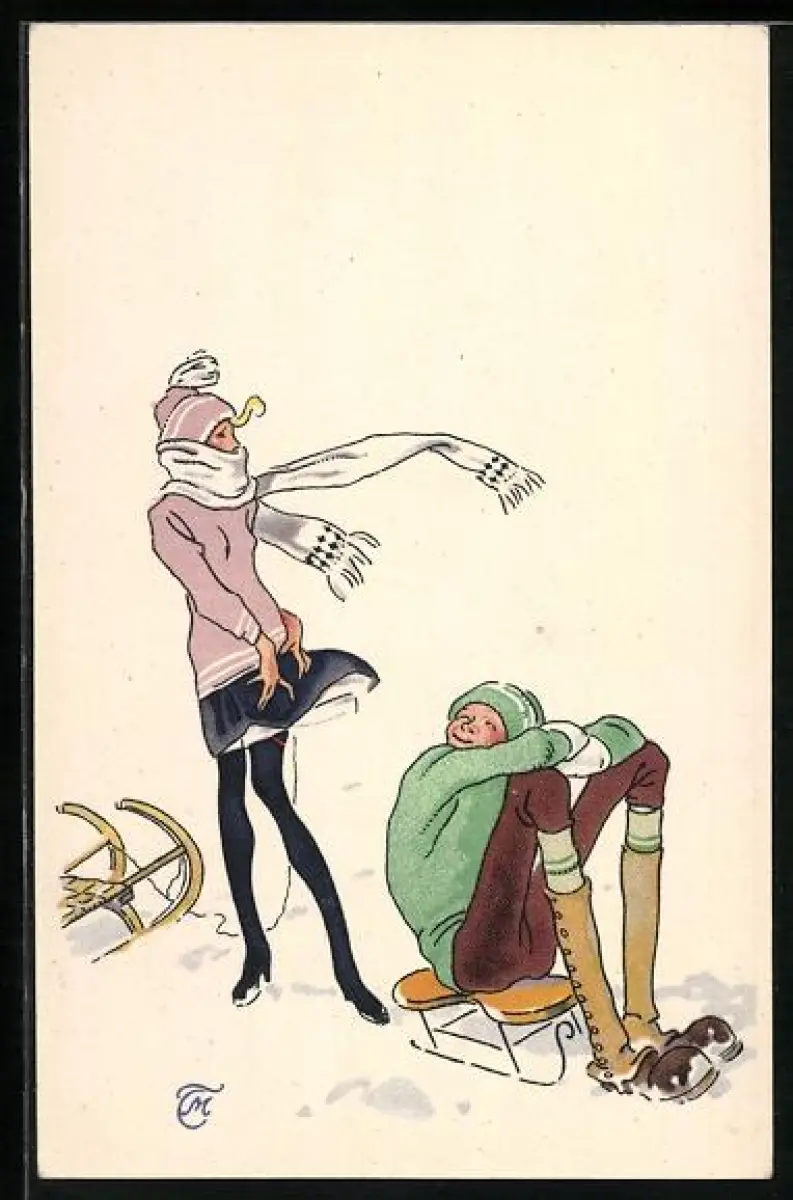 Künstler-AK Mann blickt vom Schlitten hinauf zu seinem Mädchen