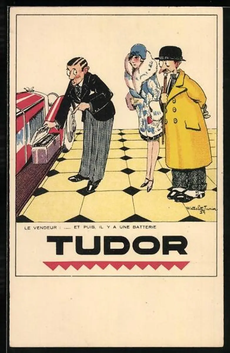 Künstler-AK Mann demonstriert die Tudor Batterie an einem Auto