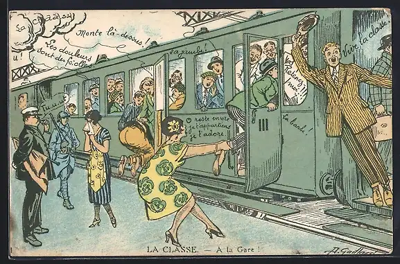 Künstler-AK Mann flüchtet vor einer Frau in den Zug