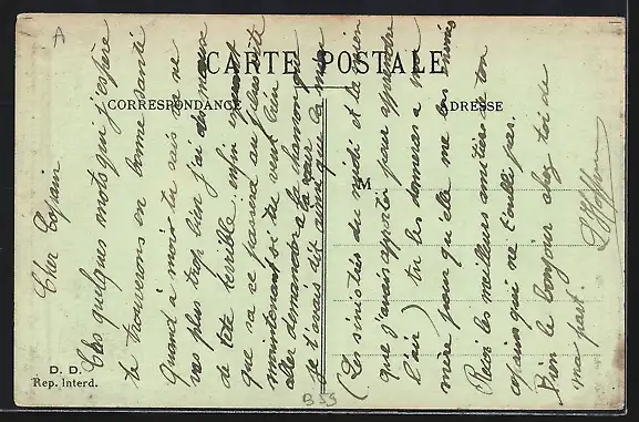 Personenbezogene Daten auf der Rückseite der Karte wurden durch blauen Textmarker unkenntlich gemacht. Die blauen Stellen sind auf die Vorderseite durchgeweicht und wirken sich negativ auf das Postkartenfoto aus