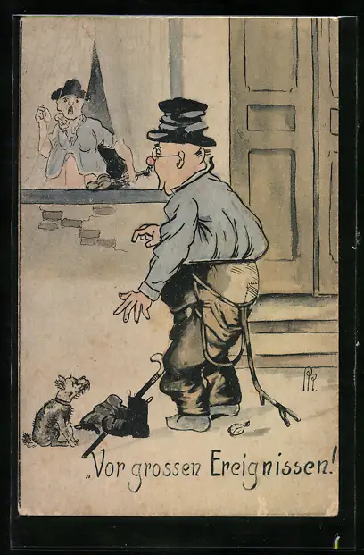 Künstler-AK Mann hat Angst von seiner Frau beschimpft zu werden, frauenfeindlicher Humor