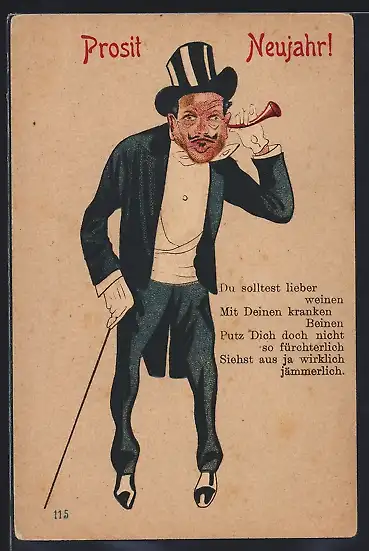 Künstler-AK Mann im Anzug mit Höhrrohr, Neujahrsgrüsse, Du solltest lieber weinen mit deinen kranken Beinen...