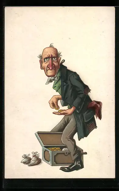 Künstler-AK Mann in alter Kleidung mit Geldkiste