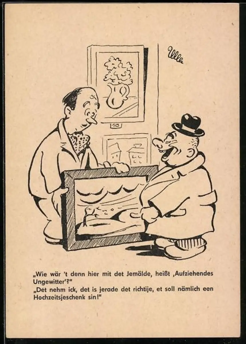 Künstler-AK Mann in einer Galerie, Wie wär`t denn hier det Jemälde..., Berliner Zeitung