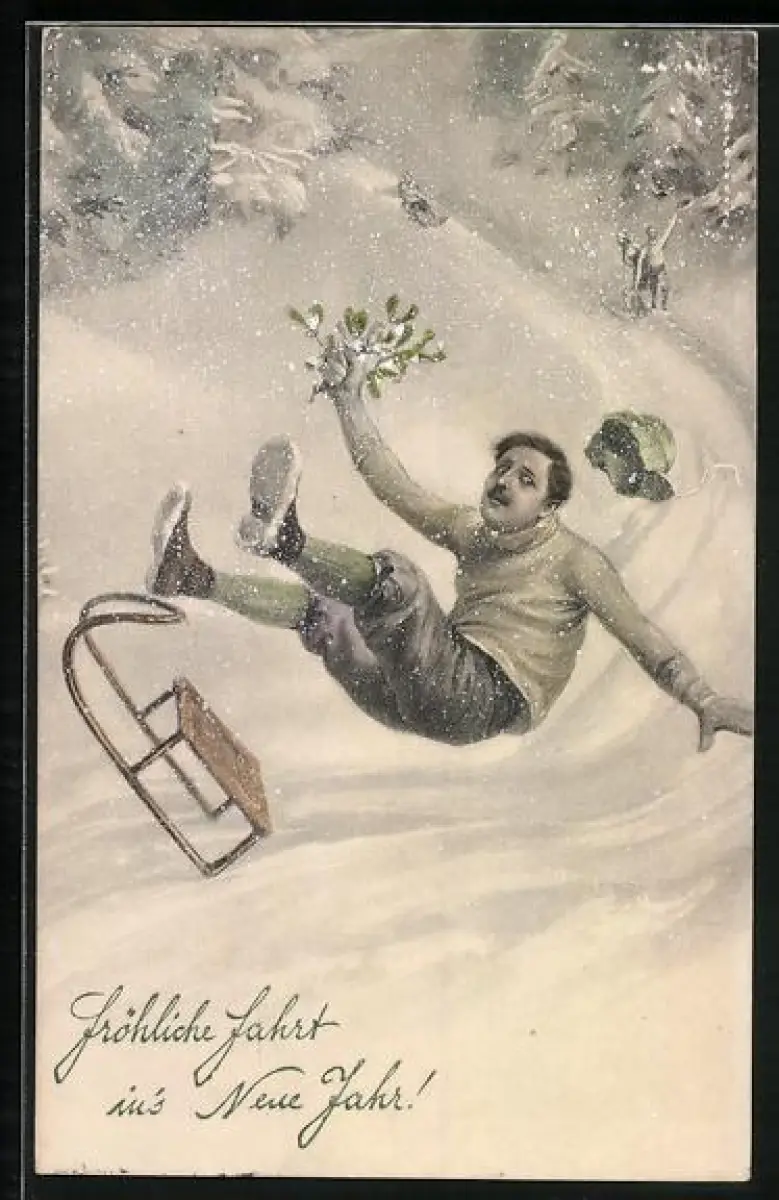 Künstler-AK Mann mit Mistelzweig fällt von seinem Schlitten, Fröhliche Fahrt ins neue Jahr