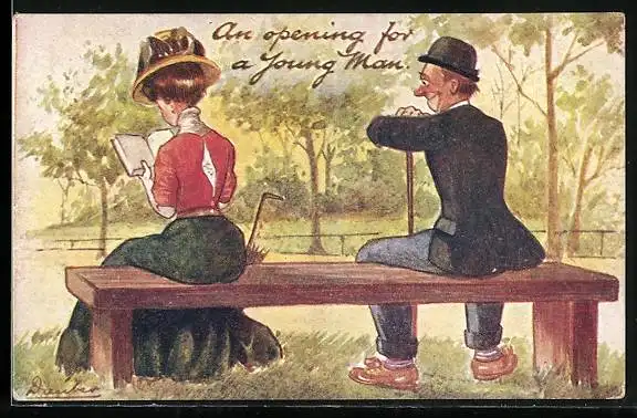 Künstler-AK Mann schaut einer Frau aufs offene Kleid, Erotik
