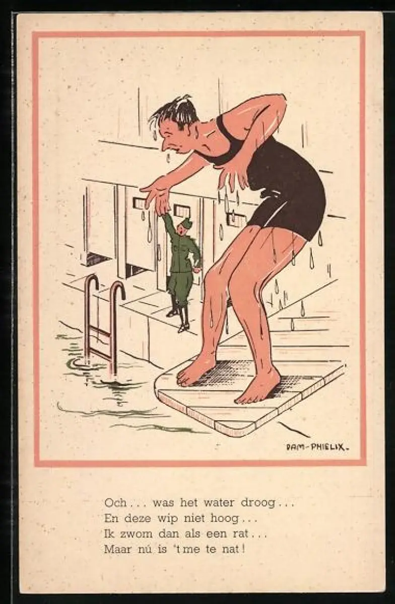 Künstler-AK Mann steht im Badeanzug auf einem Sprungbrett