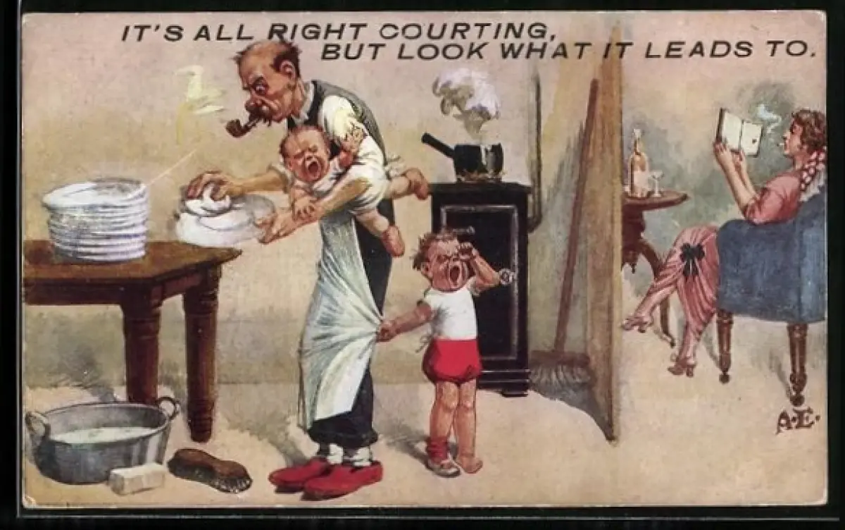 Künstler-AK Mann übernimmt die stereotypischen Aufgaben einer Frau, während diese liest und raucht