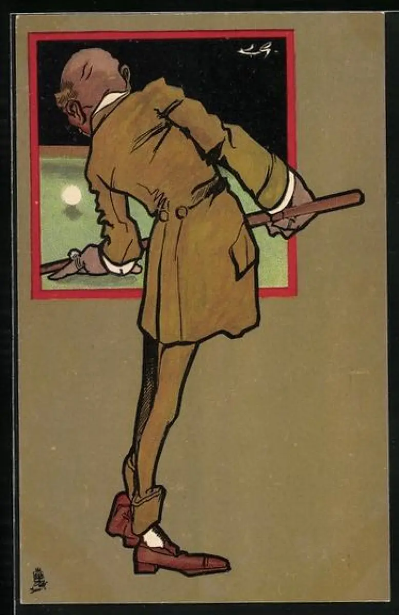 Künstler-AK Mann verbiegt sich für seinen Billard-Stoss