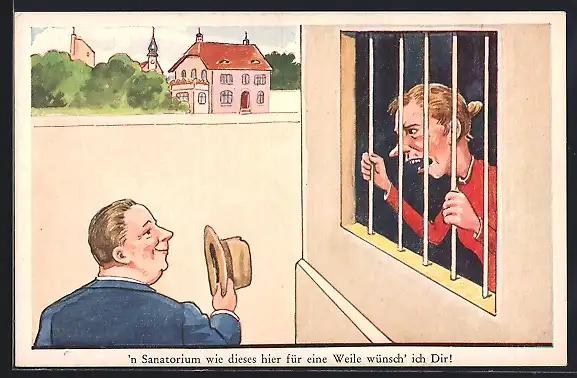 Künstler-AK Mann wünscht seiner Frau ein Sanatorium wie ein Gefängnis, frauenfeindlicher Humor