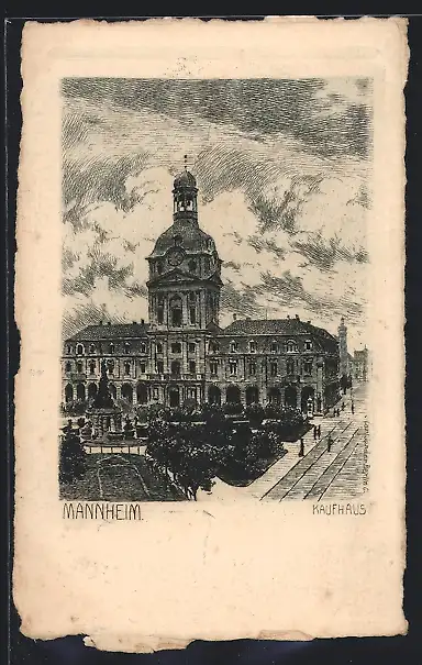 Künstler-AK Mannheim, Kaufhaus mit Denkmal