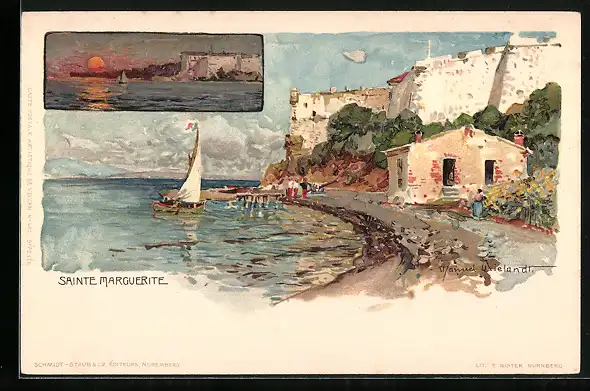 Künstler-AK Manuel Wielandt: Sainte Marguerite, Segelboot legt am Strand an