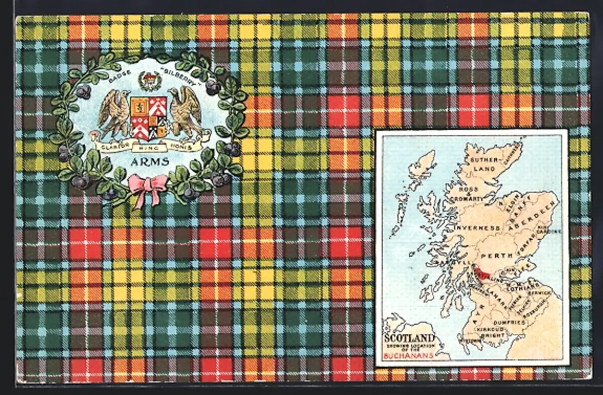 Künstler-AK Map of Scotland with a Stirling Coat of Arms, Badge Bilberry
