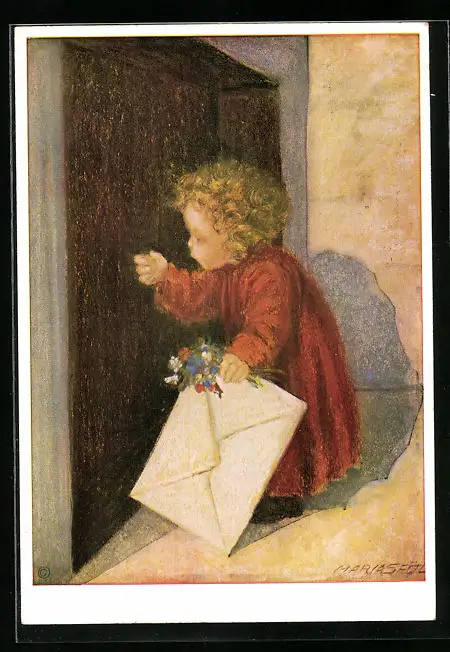 Künstler-AK Maria Spötl: Ich soll viel Gutes wünschen, Kind mit Brief