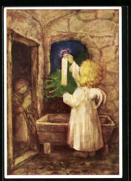 Künstler-AK Maria Spötl: Vorbereitung, Engel entzündet Kerze