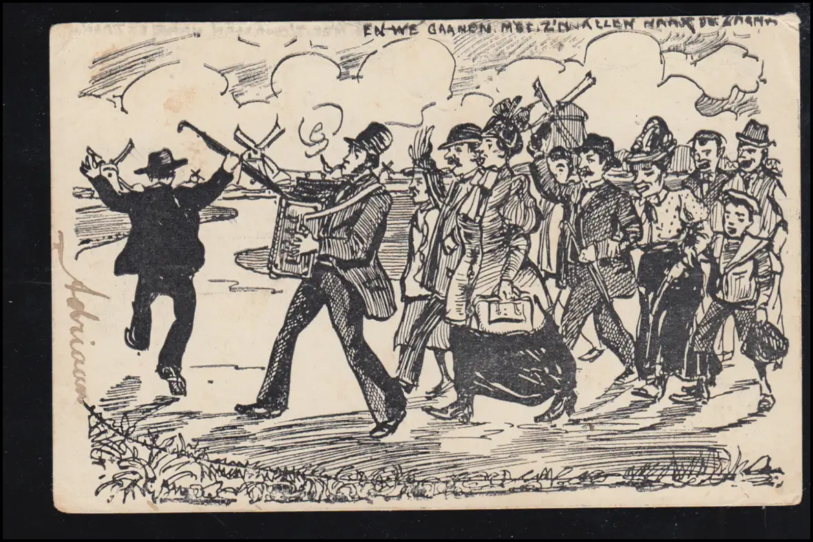 Künstler-AK Marschmusik - Lustiger Musikantenumzug mit Windmühle, beschriftet