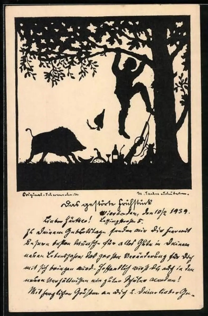Künstler-AK Marta Sachse-Schubert: Eber jagt Jäger, Scherenschnitt