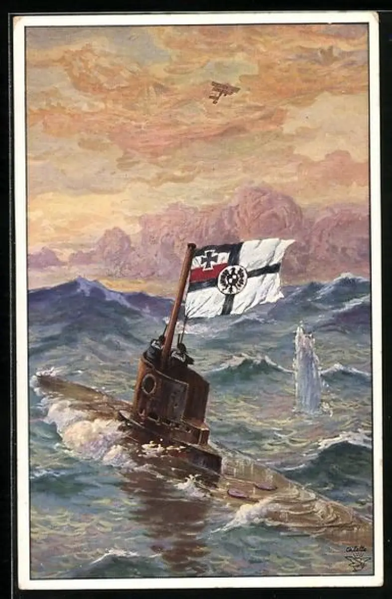 Künstler-AK Matrosen eines U-Bootes beschiessen Flugzeug