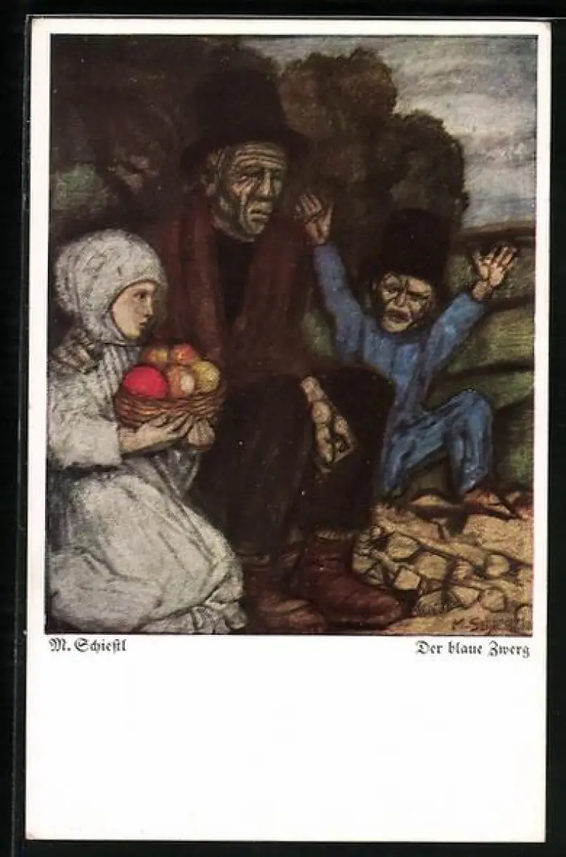 Künstler-AK Matthäus Schiestl: Der blaue Zwerg, alter Mann und Mädchen mit Obstkorb