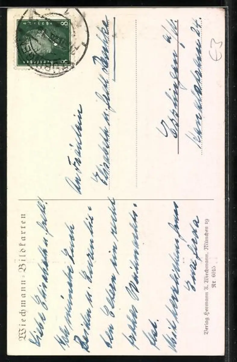 Personenbezogene Daten auf der Rückseite der Karte wurden durch blauen Textmarker unkenntlich gemacht. Die blauen Stellen sind auf die Vorderseite durchgeweicht und wirken sich negativ auf das Postkartenfoto aus