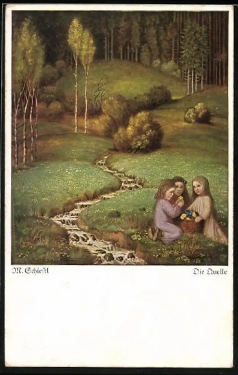 Künstler-AK Matthäus Schiestl: Mädchen pflücken Blumen an einer Quelle