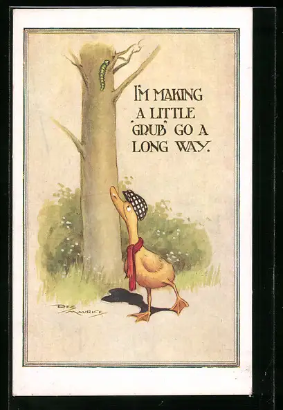 Künstler-AK Maurice: Ente blickt hungrig zu einer fetten Raupe
