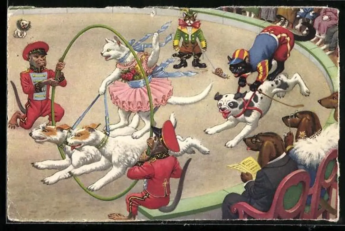 Künstler-AK Max Künzli: Katzen im Kostüm als Zirkusartisten, Affen halten den Reifen, Hunde als Zuschauer