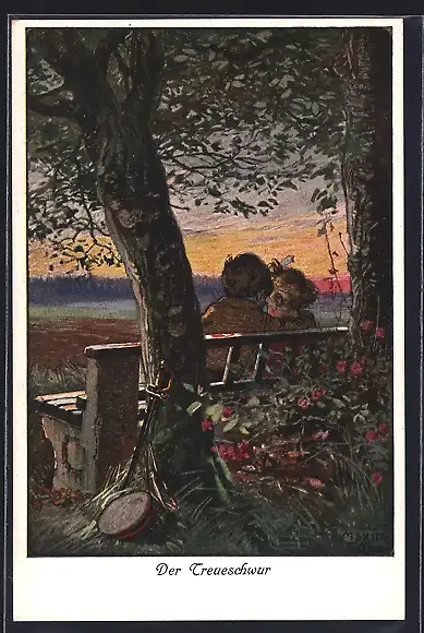 Künstler-AK Maxim Trübe: Der Treueschwur Kleines Liebespaar auf einer Bank