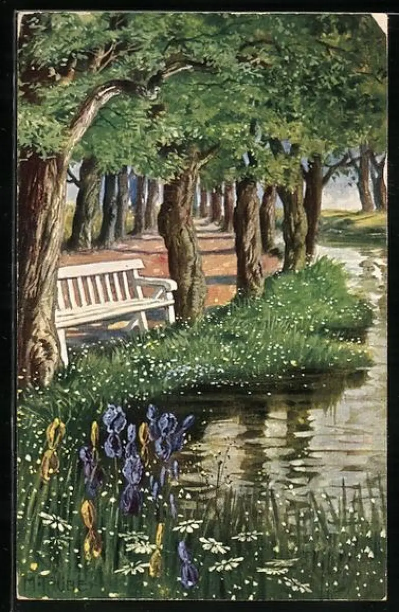Künstler-AK Maxim Trübe: Sitzbank und blühende Blumen am Ufer