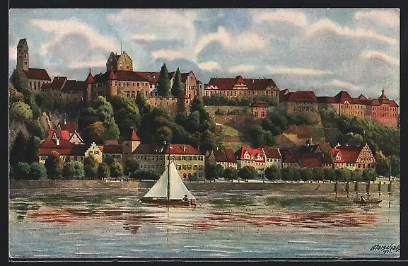 Künstler-AK Meersburg am Bodensee, Teilansicht und Segelboot