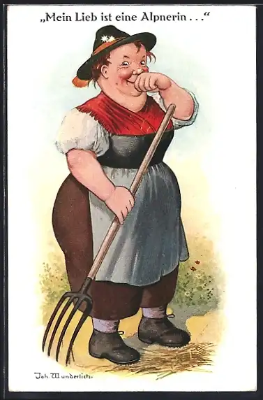 Künstler-AK Mein` Lieb ist eine Alpnerin..., Dicke Magd mit Heugabel