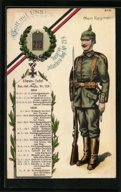 Künstler-AK Mein Regiment, Reserve-Infanterie-Regt.-No 219, Soldat in Uniform mit Karabiner